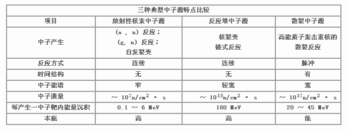 上世纪80年代起,由质子加速器驱动的散裂中子源,逐渐进入实际应用阶段。其原理比较简单,用高能强流质子加速器,产生1 GeV左右的质子轰击重元素靶(如钨或铀),在靶中产生散裂反应。散裂中子源的特点是在比较小的体积内可产生比较高的脉冲中子通量,能提供的中子能谱更加宽广,大大扩展了中子科学研究的范围。表1给出了三种典型中子源的特点比较。