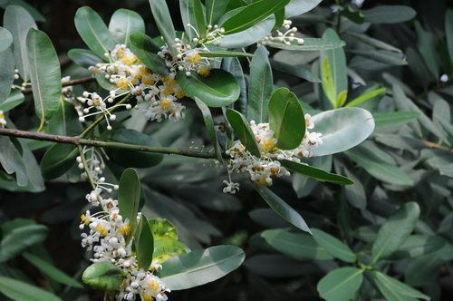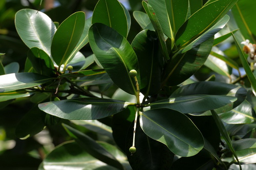 琼崖海棠(Calopwyllum inophyllum linn)属藤黄科(Guttiferae)常绿乔木,又名红厚壳,盛产于我国的海南省和台湾省,为优良的庭园观赏及海岸防护林树种。其树冠锥形至伞形,树皮厚,呈灰褐色或暗褐色,有纵裂缝,创伤处常渗出透明树脂;叶厚革质,阔椭圆形至倒卵形,顶端钝形、圆形或微缺,基部钝形,两面均有光泽,全缘;叶柄粗壮;其花白色,金黄色花蕊群聚于中部,散发着芳香,跟我们熟悉的茶花有几分相识,衬托着浓绿的叶子很是特别。花期通常在八月,持续两周左右的时间。花谢后结出一颗颗绿色球型的核果,成熟的核果变成黄褐色,果实略有甜味,可生食,未成熟的果实可用糖腌制后再吃。