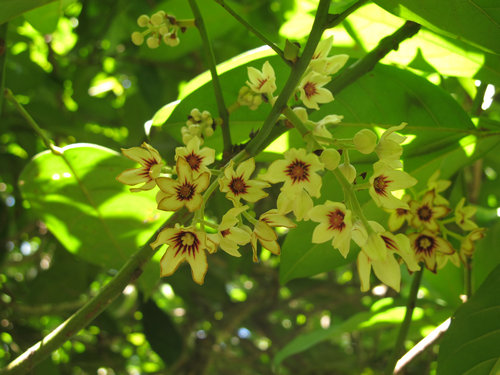 可乐树是原产于热带非洲的一种常绿乔木,高可达20米。叶子长卵形,互生,数朵小花形成圆锥花序生于枝干。花有雄花和雌花之分,雄花雄蕊数枚,两轮排列,雌花柱头五枚呈辐射状,基部有数枚不育雄蕊。雌雄花都有5枚质地硬而厚的花瓣。五枚心皮形成的蓇葖果呈海星状,每个心皮有2-4颗种子。