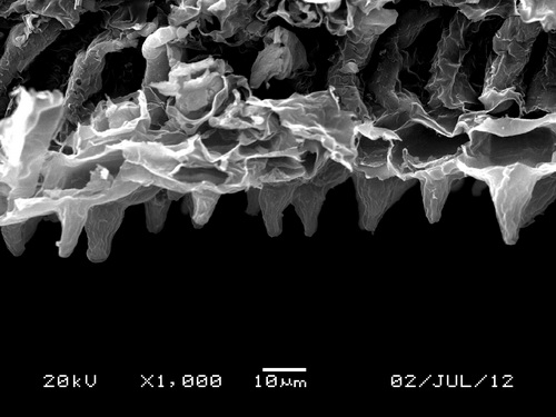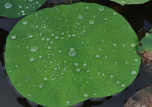 原来,在荷叶的上表面布满非常多微小的乳突,乳突的平均大小约为6-8微米,平均高度约为11-13微米,平均间距约19-21微米。在这些微小乳突之中还分布有一些较大的乳突,平均大小约为53-57微米,它们也是由6-13微米大小的微型突起聚在一起构成。乳突的顶端均呈扁平状且中央略微凹陷。这种乳突结构用肉眼以及普通显微镜是很难察觉的,通常被称作多重纳米和微米级的超微结构。这些大大小小的乳突和突起在荷叶表面上犹如一个挨一个隆起的“小山包”,“小山包”之间的凹陷部分充满空气,这样就在紧贴叶面上形成一层极薄,只有纳米级厚的空气层。水滴最小直径为1-2毫米(1毫米=1000微米),这相比荷叶表面上的乳突要大得多,因此雨水落到叶面上后,隔着一层极薄的空气,只能同叶面上“小山包”的顶端形成几个点的接触,从而不能浸润到荷叶表面上。水滴在自身的表面张力作用下形成球状体,水球在滚动中吸附灰尘,并滚出叶面,从而达到清洁叶面的效果。这种自洁叶面的现象被称作“荷叶效应”。