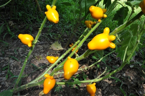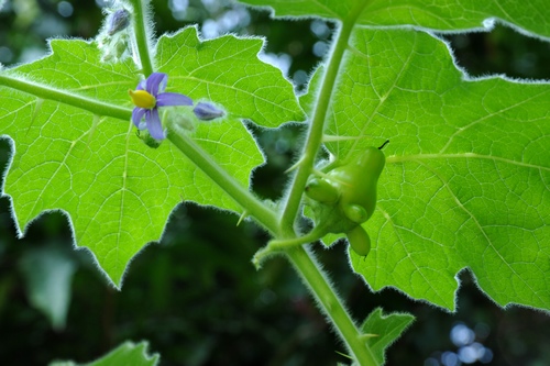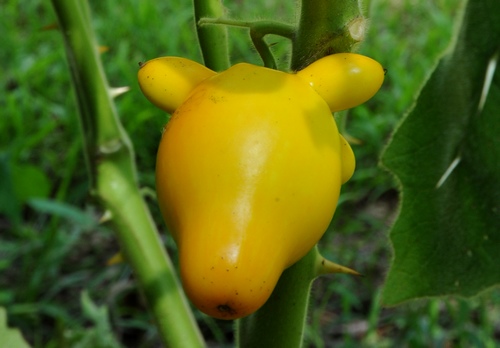乳茄(Solanum mammosum Linn.),茄科(Solanaceae)直立草本,高约1米。全株被短柔毛及蜡黄色扁刺;叶卵形,长5-10厘米,常5裂,有时3-7裂,裂片浅波状;蝎尾状花序腋外生,常着生于腋芽的外面基部;通常3-4花,花冠紫槿色,筒部隐于萼内,冠檐直径25-32毫米,5深裂;雄蕊5枚,花药长圆状锥形;子房无毛,柱头绿色,浅2裂。浆果倒梨状,长4.5-5.5厘米,外表黄色,果内白色,具5个乳头状凸起,种子黑褐色,直径约3毫米。花果期为初夏至秋末。
