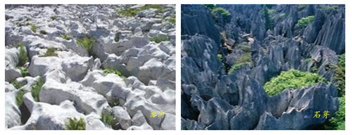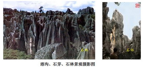成片裸露、岩层厚度大的可溶性岩石节理裂隙和层面受地表水溶蚀、侵蚀,使岩石表面形成沟槽形态,凹槽称为溶沟,沟槽间的突起称为石芽。在热带、亚热带地区,水热条件充沛,水的溶蚀性强,石芽在强烈的岩溶作用下生成一种特殊形态,形体高大,石芽之间的溶沟很深,沟坡垂直,坡壁上刻有平行垂直的凹槽,即石林。这类喀斯特景观的典型代表是著名的云南路南石林,石林相对高度一般20米左右,大者可达50米左右。