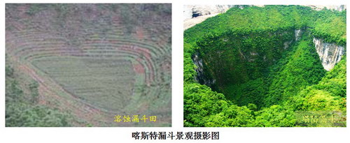 喀斯特漏斗,又称“斗淋”、“溶斗”、“盘坑”、“盆坑”等,是喀斯特地面经溶蚀及岩溶塌陷后,形成口大底小的倒锥状的封闭洼地景观。地表水沿可溶岩裂隙密集地段溶蚀而成的是溶蚀漏斗,其深度不大,斗壁和缓,斗缘不明显,外形多成碟状,当进一步向下加深时,斗壁逐渐陡峻并且有明显的斗缘,成为漏斗状;地下可溶性岩溶蚀后会形成大小不一的洞穴,在重力作用下,覆盖在洞顶上的土层或岩层崩塌,进而形成的则是塌陷漏斗。漏斗底部通常有通道(或落水洞)通往地下,起着集水和消水的作用,并伴有积土、碎石堆积。