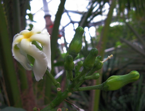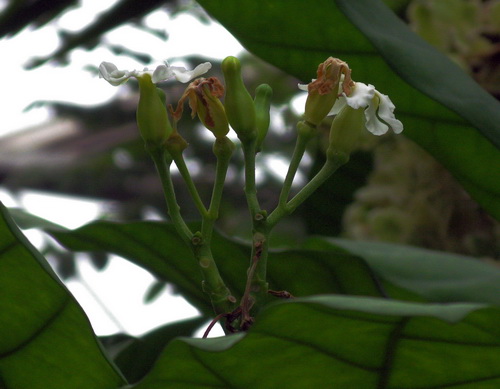 属乔木,最高能长到25米;树皮浅棕色;分枝具有皮孔;叶柄短或无,叶片倒卵状至长圆形,下延的基部楔形,叶背面具短柔毛。这种植物的花非常有意思,花序伞形般聚生于顶端的枝条,通常数朵同时开放,长长的花柄顶着筒状的花萼,未绽放的花朵像一颗颗青绿色的橄榄,而五片狭长形的白色花瓣则由橄榄的顶部艰难的挤出,扭曲成螺旋状,远看就像一个个美丽的风车迎风旋转,而淡黄色的基部更给小小的风车增添了几分俏皮。值得一提的是,首先注意到它的人并不因为它的花形而是迎面扑鼻的花香,淡淡的花香总是给人以爽朗和愉快的感觉,让很多人闻香识花。不过你可要小心,这种花香闻多了会使你头晕哦。