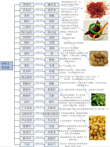 1、香料的类别按照属及口味特点进行区分统计,例如樟科的月桂属香叶和樟属的肉桂及木姜子属的木姜子三者之间有较大区别,因此统计为3个类,而如樟属的中国肉桂及斯里南卡肉桂属于2种植物,但是味道类型区别不大,因此划为一类记作2个物种。