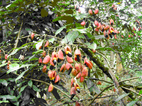 在西双版纳热带植物园内云南牛栓藤花期1月至4月,果期4月至翌年2月。作为冬季果实成熟的观赏植物,其最大特点是:果期长,幼果绿色-熟果黄至红色-种子黑紫色-假种皮橙色,色差观感层次分明,色泽光亮,成熟果实观赏性较强。