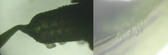 左图示膝曲的花柱;右图示花瓣上的腺毛