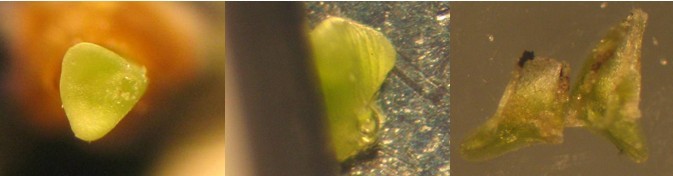左图示柱头喙上的柱头孔;中图示轻压柱头,柱头孔溢出粘液;右图示剖开的柱头(里面竟然是空的,还藏了很多花粉…)