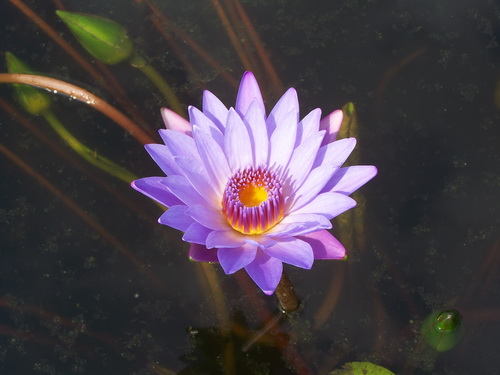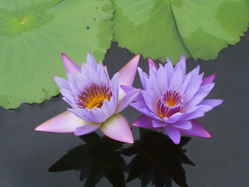 一池清水,微波荡漾,碧油油的叶子平铺在水面上,迎着朝阳,三、两朵埃及蓝睡莲的花朵从植株中心挺出水面,色泽鲜美,清丽妖艳,微风拂过,送来阵阵幽香,令人心旷神怡;放眼望去,蓝色的大花朵,含苞待放的花蕾,还有水面的倒影三者相映成趣,赏心悦目,美不胜收。