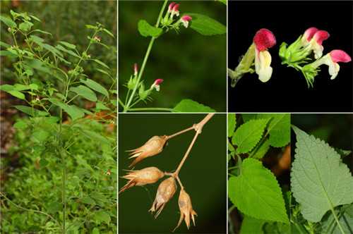 花:冠檐二唇形,上唇盔状直立,背面钝圆,顶部平伸,基部水平的近截形,下唇与之等长,先端3裂,裂片圆形,中裂片较大。雄蕊4,近等长,微外露,花丝扁平,无毛。花柱丝状,先端极不相等2浅裂。花盘杯状。子房裂片球形,无毛;