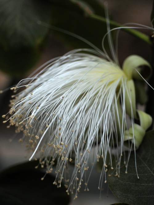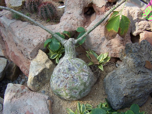 这位“兄弟”来自美洲的墨西哥,为木棉科木棉属多年生肉质植物。其肉质茎的下部不规则膨大,形态奇特,如同一只静卧在地上的巨乌龟;外皮灰色,分布有浅绿色斑纹,表皮龟裂如龟壳,其中贮存了大量水分,以适应干旱炎热的沙漠环境,名如其形,人称:龟纹木棉(Bombax ellipticum)。顶生绿色短枝,高一般不及1m。掌状复叶互生,叶5片,长椭圆形,唯有此点与其“兄长”木棉有几分相似,休眠期叶片会脱落。早春开花,花朵硕大,开放时,花冠为数百条白丝组成,花丝多而长,生长于枝条顶端,呈半球形放射状,若数朵并放,银丝万缕,别有一番风采。