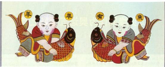 说到鱼类吉祥物,大多是从语言的谐音而来,少数是根据鱼形状、习性而来。例如:“连年有余”的吉祥图案,寓意生活美好;结婚用品上的“双鱼吉庆”,寓意婚后美满;店铺上的“渔翁得利”出自古代谚语“鹬蚌相争,渔翁得利”,寓意生意发达;2008年北京奥运会的吉祥物——五福娃之首“福娃贝贝”象征繁荣,也有依据鱼体形态、习性寓意吉祥;如体形似龙的龙鱼,寓意“风水鱼”、“招财进宝”、“逢凶化吉”;胭脂鱼背鳍高大似帆,寓意“一帆风顺”等;鲤鱼产卵多,因而有“富贵有余”吉祥之意。在我国三千多种鱼类中,吉祥语大多泛指某一类,特别指定某个种或某些种的不多,估计有40多种(张世义、伍玉明2006)