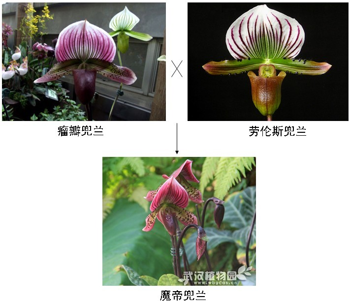 魔帝兜兰(Paphiopedilum Maudiae)是瘤瓣兜兰(Paph.callosum)和劳伦斯兜兰(Paph.lawrenceanum)的杂交种,由著名的查尔斯沃思公司于1900年培育而成。它主要分为红花系、绿花系两种。红花系:花色暗红、浅红到红绿白相间;绿花系:花色为白底绿线条。武汉植物园此次展出的是红色系。