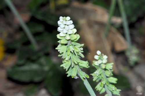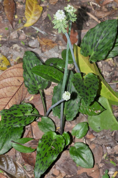 阔叶油点百合,也叫非洲玉簪Drimiopsis maculata (African hosta),天门冬科绵枣亚科的草本,是来自南非的多年生观赏植物。有几株种植在西双版纳热带植物园树木园的蜘蛛抱蛋丛中,现在正在开花。它叶片浅绿,全部丛生,上面散布深色的斑点,是有趣的观叶植物。叶以上伸出高高的花葶,顶端挨挨挤挤是白色转绿色的小花;叶以下是翡翠色的膨大鳞茎。整个植物矮小紧凑,是招人喜欢的盆栽植物。喜半荫、排水良好、温暖的环境,稍耐低温。可分株繁殖。大面积种植时并不起眼,如果栽植到岩石植物区,则会非常醒目。