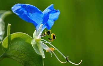 此外,花内雄蕊除了存在花丝长短的分化,也有花药颜色的分化。其内轮雄蕊较少,但花丝很长,且反折隐蔽于分叉的柱头之下,而外轮数量众多的雄蕊花丝短,颜色鲜艳,给访花者喂食花粉。当访花者取食这些短小雄蕊的时候,上方的长雄蕊花药将花粉释放到访花者的背部。这些花药颜色的分化主要是通过部分具有鲜艳颜色的雄蕊或花药起到吸引传粉者的作用,另外一部分不显眼的雄蕊则通过直接碰触传粉者的身体来提高花粉输出率,可以减少传粉者对这些花粉直接取食而造成的花粉损失。例如,鸭跖草(Commelina communis)雄蕊分化成3类,位于花侧的颜色暗淡的2个雄蕊、位于花中央颜色暗淡的1个雄蕊,另有3个鲜黄色的退化雄蕊,这3个颜色鲜艳的退化雄蕊通过形态和颜色模拟成饱含花粉的样子吸引了大量的访花者。