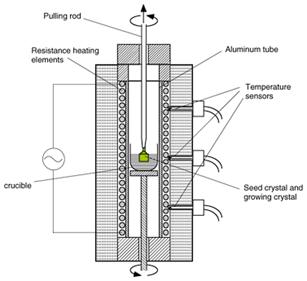 BGO晶体由于具有密度大、化学稳定性好、不溶于水或有机溶剂、机械强度高等优良性能,是一种理想的闪烁晶体材料。生长高质量BGO晶体必须具备以下条件:高纯原料,严格配比,苛刻的生长环境,氧化气氛。目前BGO单晶体主要通过提拉法和坩埚下降法生长。图1是用以单晶生长的提拉法示意图。自1965年第一根GBO单晶成功生长以来,BGO晶体经历了跨越式发展,不仅在高能物理、核医学成像领域有广泛应用,在核燃料扫描、地质勘探等方面也有重要作用。