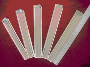 二十世纪八十年代,欧洲核子研究中心开始建造当时世界上能量最高的正负电子对撞机(Large Electron-Positron collider,简称LEP)。LEP位于瑞士和法国边界,周长27公里,包括ALEPH、DELPHI、L3和OPAL四个大型实验设施。其中,L3是进行宇宙线缪子和推断大气中微子能谱的精确测量装置,由著名美籍华裔科学家丁肇中教授负责。L3的核心部件是电磁量能器,用以探测高能粒子和探索宇宙形成时的奥秘。要求闪烁晶体不仅具有高密度、快衰减和高抗辐照性,还需要价格低廉、批量生产、尺寸巨大。因此,只有性能优良的高质量、大尺寸BGO晶体(图2)满足其要求。通过克服坩埚漏料、成分不均匀等技术难题,在改进的坩埚下降工艺技术的基础上,中国科学院上海硅酸盐研究所成功实现了高质量、大尺寸BGO晶体的批量化生产,为欧洲核子中心和GE公司等科研生产机构提供了大量的高质量BGO晶体,在国际上赢得了相当高的荣誉。