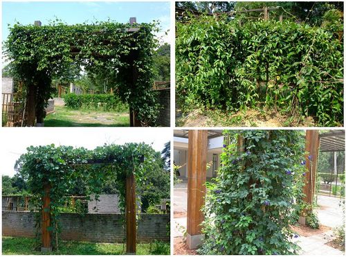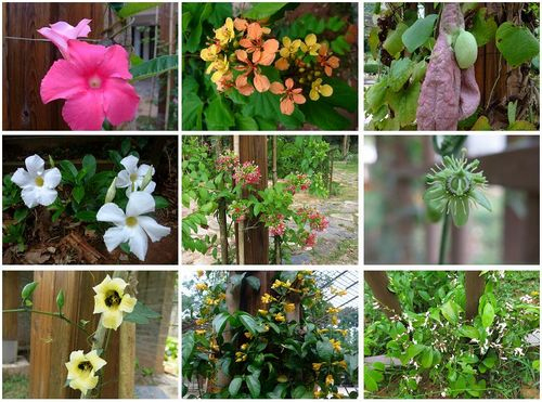 西双版纳热带植物园2012年12月建成的藤本园,充分展示了几百种藤本植物的神奇魔力。园中的西番莲属、羊蹄甲属、金银花属、山牵牛属、崖爬藤属等藤本植物已缠满篱、爬满架、挂满墙。园中可观察到龙须藤、油瓜、大果西番莲等植物的卷须无孔不入,小小缝隙都不放过,一旦抓住就步步攀援向上生长。薜荔、黄花胡椒等用根系紧紧地吸附着墙面向上生长。藤本园中的红花龙吐珠Clerodendrum X speciosum、红花桢桐 Clerodendrum splendens、美丽马兜铃Aristolochia littoralis、巨花马兜铃Aristolochia gigantea、重瓣使君子Quisqualis indica‘Double Flowered’、蝴蝶藤Passiflora papilio、红纹藤Mondevilla X amabilis‘Alice Du Pont'、白纹藤Mandevilla sanderi‘My Fair Lady'、沃尔夫藤Petraeovitex wolfei、橙黄羊蹄甲Bauhinia bidentata等花开胜美,是展示藤本植物神奇魔力与开展藤本植物行为生态学研究的理想园地。