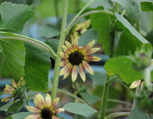 玫瑰情(Helianthus ‘Cherry Rose”):花朵的样子和“三阳开泰“有点类似,只是舌状花种无论黄色还是紫红色部分都要淡些,不那么炫目,婉约些,整体的花朵小一些,这更符合这个羞答答的名字。播种约30天左右现蕾,50天左右盛开,花期持续2周;高120-130厘米,适合切花和庭院种植。