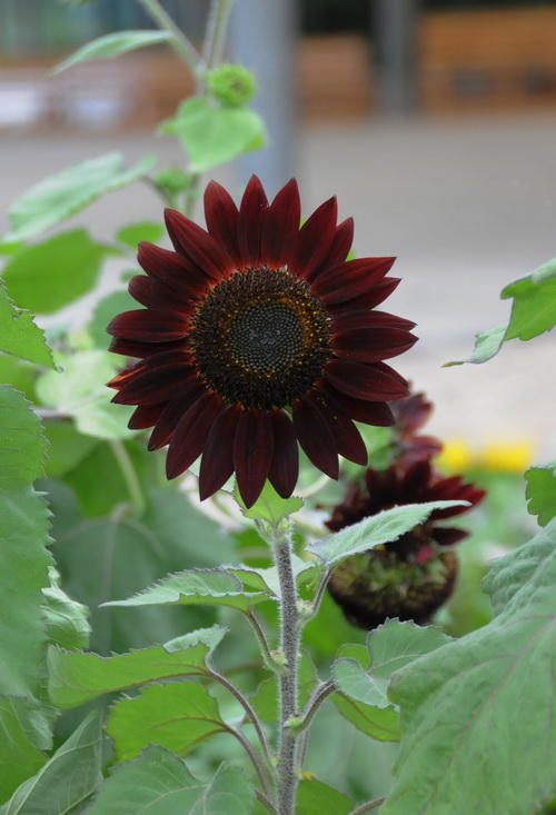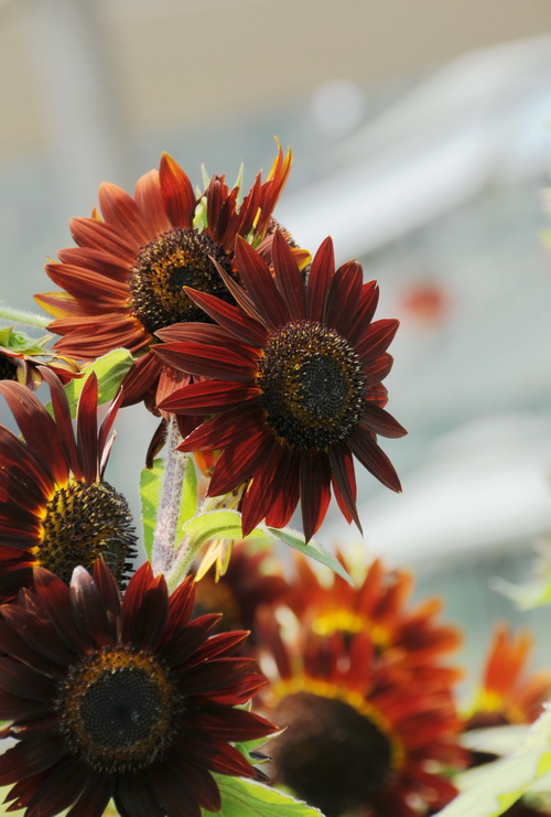 醉云长(Helianthus ‘Moulin Rouge’):一听到名字就可以想象出花的颜色。关云长的脸是红色的,喝醉了又变成紫红色,这个品种的花色的确是紫红色的,中文名起的太形象!值得一提的是它在七博会切花花材评比中获得了金奖。花期较早,播种后35天左右可现蕾,55天左右盛开。株高150-160厘米,适合庭院栽种或作切花。