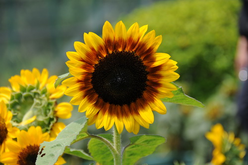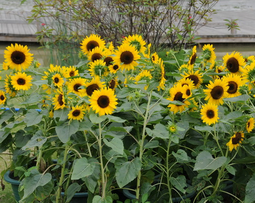 开心小矮人(Helianthus ‘Junior’):说它是小矮人,是指其株型矮小,每次布展都得把它摆在最前面。这是一个很好的盆栽向日葵品种,花朵为标准的向日葵样式:舌状花金黄色,管状花棕黑色;多头品种,顶生花直径12厘米左右,播种后30天左右现蕾,52天左右盛开,盛花期为15天左右,常做切花瓶插或者做成花束。