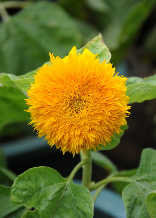 玩具熊(Helianthus ‘Teddy bear’):瞧他那萌样,就知道名字的来历了,这是一种矮个子向日葵,高30-50厘米,叶缘缺刻或锯齿状粗糙。头状花序单生茎顶约15-20厘米,花金黄色,重瓣,管状半圆形,适于宅旁空地种植或园林中的背景材料,也可用于花境或盆栽。