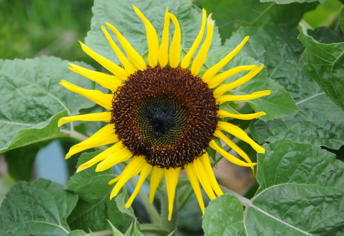 墨池吐金(Helianthus cv.):这是舌状瓣非常稀疏的一个品种,大大的管装瓣,深黑色,就像一个墨池,很好的阐释了这个名字。成熟期60天。株高160cm,单干,花盘直径12cm。抗病性好。可用做切花或庭院美化。