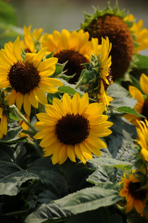 美丽微笑(Helianthus ‘Beautiful Smile’):可以称之为向日葵花中的“微笑姐”,虽然株型只有60-70厘米,但植株健壮,花朵很大,直径可达18厘米,明黄色的花瓣配上棕色的花盘显得格外耀眼,非常适合盆栽和庭院栽种。在花展中是小朋友们的最爱。播种后35天左右现蕾,55天左右盛开,花期约20天。