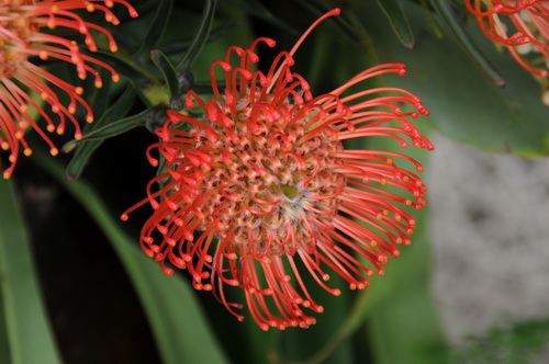 针垫花(Leucospermum sp.)又名风轮花、针包花、针垫山龙眼等,属于山龙眼科针垫花属(Leucospermum)植物。全属植物约50多种,主要分布在南非和津巴布韦等地。常绿蔓性灌木,少数为小乔木,叶轮生,硬质,多为针状、心脏形或矛尖状,边缘或叶尖有锯齿;花序密集,头状花序,单生或少数聚生;花冠小,针状。从它的植物学特征的描述可以看出这种植物有些古老和原始。确实,针垫花是南非本土的植物品种,生长在酸性、贫瘠的土壤环境中,在冬季多雨季节和炎热、干燥的夏季开花。据说,在南非开普角保护区还遗存有世界上为数不多的金黄色针垫花,成为植物王国里不可多得的活化石。如今的针垫花是通过众多的鲜花布景被世界各地的游人认识,从而走出国门,并分布于世界的每一个角落,成为一个非常流行的园艺品种,也被广泛用作鲜切花。