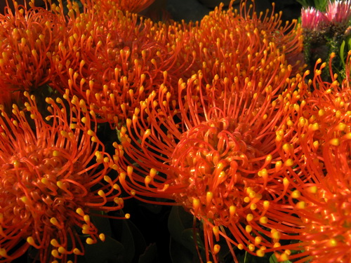 针垫花,形如其名,花朵盛开时像大头针插在球形的针垫上,非常少见,十分美丽。颜色鲜艳夺目,五色缤纷,很是招人喜爱,常见的颜色有红色、黄色、橙色等。其实我们所见到的拳头般大小花球是由无数个小花朵组成的,那伸出的“针头”正是一个个舞动的花蕊。据了解,在南非针垫花开的季节还有一个非常吸引人的景色,那就是无数个围绕在花丛中的小鸟。针垫花不能自花授粉,必须以丰富的花蜜吸引了各种各样的昆虫,而这些昆虫必须穿越密布的“针林”才能享受到甜美的花蜜,而昆虫正是小鸟们猎食的对象。正是这样,针垫花不仅吸引了观花者,同时也吸引了众多观鸟者。