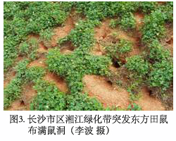洞庭湖区可说是东方田鼠的大本营,但它不仅会在沿江各处(如安徽贵池)突然冒头,而且湘南的高山草地(城步县南山牧场,海拔1760m左右,植被以禾本科、菊科为主)、浙江宁海县的滨海稻田,也曾突发危害,然后又消失得无影无踪,给人以神出鬼没之感。图3是长沙市区湘江边2003年突发东方田鼠,绿化带遍布鼠洞的情景,平常年份很罕见。