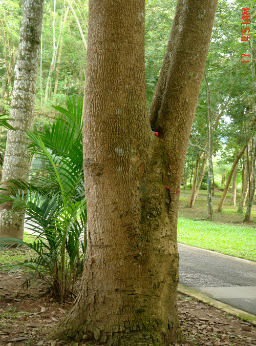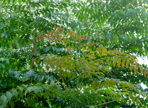 格木Erythrophleum fordii Oliv,为苏木科,格木属,常绿乔木,高达30米,胸径可达1.2米;树皮灰褐色或黑褐色;小枝密生黄色短柔毛;叶互生,二回羽状复叶;卵形或卵状椭圆形,全缘。穗状花序排列成圆锥花序,花萼钟状,花瓣5枚, 荚果扁平带状,近木质,棕褐色或黑褐色,种子长圆形,稍扁,种皮黑褐色。花期5-6月;果期8-10月。