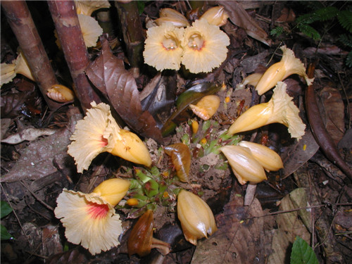 国产的闭鞘姜属植物并不多,总共才有五个种,其中光叶闭鞘姜(Costus tonkinensis Gagnep.)有些特殊:只有它是从根茎基部直接抽出花序来,贴近地面开花,而其余的四个种则都是顶生花序,在枝头开花。