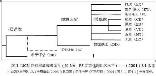 为了实施物种保护,需要明确物种的生存/濒危状况,首先须建立评定标准。世界自然保护联盟(IUCN)自1966年起,先后出版了《哺乳动物红皮书》和其它动、植物红皮书,其中提出了濒危物种等级标准,得到国际的广泛认同。在此基础上,为了进一步完善,IUCN对该等级标准进行了多次修订,最主要的版本有两个:①1994年11月IUCN理事会会议正式通过的Mace-Lande物种濒危等级系统,定义了8个等级,分级标准更加明确且有数量观念,《1996 IUCN受威胁动物红色名录》采用了这个等级标准。②2000年2月IUCN理事会通过由SSC(物种生存委员会)修订形成的《IUCN物种红色名录濒危等级和标准(3.1版)》(2001),增加“无危(LC)”而成9级体系,并对“受威胁”3个等级(极危、濒危、易危)分别规定了A-E条量化亚标准;接着又提出《IUCN物种红色名录标准在地区水平的应用指南(3.0版)》(2003),增添了“地区绝灭(RE)”和“不宜评估(NA)”2个等级。图1将IUCN物种红色名录濒危等级体系“应用于全球”和“应用于地区水平”的两个结构综合为一。其中,用楷书–虚线将应用于地区水平时须增加的两级(RE、NA)在总结构中显示出来。去掉这两级就是应用于全球评估的濒危等级体系。
