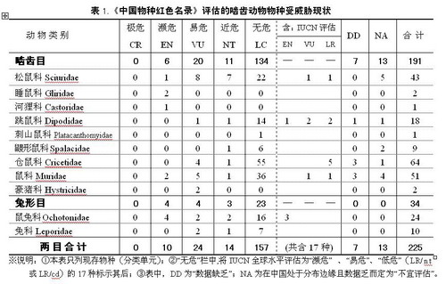 《中国物种红色名录(第一卷)》对啮齿动物共评估了2目11科的225个分类单元(其中,啮齿目依Wilson新系统,将鼯鼠类〈科〉归入松鼠科、林跳鼠类〈科〉归入跳鼠科,仓鼠科的沙鼠亚科转入鼠科,再将鼢鼠类和竹鼠类〈科〉结合而新立鼹形鼠科)。表1列出其评估的分项统计数,由此可知,225个分类单元啮齿动物中,属于濒危、易危占4.44%、10.67%,近危占6.22% ,三者合计占21.33% 。其中,处于“濒危”级的,啮齿目有河狸 Castor fiber、沟牙鼯鼠Aeretes melanopterus、林睡鼠Dryomys nitedula、四川毛尾睡鼠Chaetocauda sichuanensis、小狨鼠Hapalomys delacouri和滇攀鼠Vernaya fulva,共6种,兔形目有高黎贡鼠兔Ochotona gaoligongensis、伊犁鼠兔Ochotona iliensis、柯氏鼠兔Ochotona koslowi和黑鼠兔Ochotona nigritia,共4种。至今仅河狸已列为国家Ⅰ级重点保护,沟牙鼯鼠已列入国“三有”动物保护名单。而“易危”的24种,仅巨松鼠Ratufa bicolor、海南兔 Lepus hainanus和塔里木兔Lepus yarkandensis等3种列为国家Ⅱ级重点保护,复齿鼯鼠Trogopterus xanthipes等5种鼯鼠及2种松鼠、2种豪猪列入国“三有”动物保护名单。这就是说,至少还有8个濒危、12个易危物种,已处于“受威胁”状态却尚未列入法定保护名单,实施《野生动物保护法》的缺口还相当大。而这里讲的是啮齿动物,它们乃兽类中增殖和恢复能力特强的类群,所以显示的问题不过是冰山一角![该项目总的评估结果是:脊椎动物受威胁(极危、濒危和易危)的比例为35.92%,接近受威胁(近危)的比例为8.47%;无脊椎动物分别为34.74%和12.44%;裸子植物分别为69.91%和21.23%;被子植物分别为86.63%和7.22%。皆显著高于啮齿动物濒危比例!]