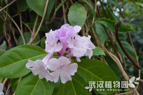 这个季节的花儿比较少了,不过步入武汉植物园的景观温室,有一种植物格外引人注目,它正怒放着花朵,像一个个的小铃铛,深深浅浅的紫色花朵分布在蜿蜒的藤子上,给人一种浪漫的气息,看起来高雅而别致,这种植物叫蒜香藤。