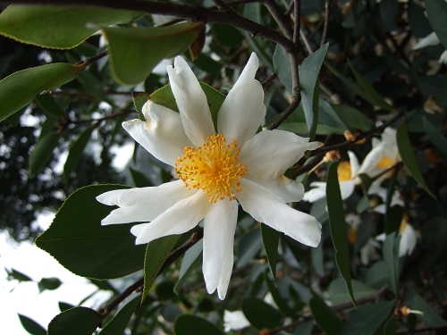 山茶园里最大的亮点是花瓣金黄如玉的金花茶,它有“茶族皇后”的美称。由于金花茶的分布区狭窄,为我国特有植物,已被列为国家一级重点保护植物,被视为“植物界的大熊猫”。金花茶(Camellia chrysanthera (Hu)Turyama)为山茶科常绿灌木或小乔木,高2—5米。花金黄色,耀眼夺目,仿佛涂着一层蜡,晶莹而油润,似有半透明之感。花期一般为春节前后。