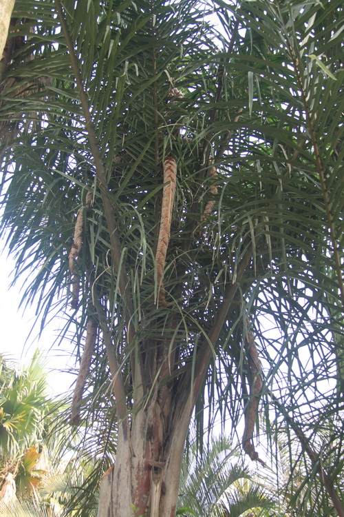 树上能长出又大又长的“大象鼻子”吗?华南植物园的两株棕榈树上就长出了这样的“大象鼻子”。这种棕榈树名为象鼻棕(Raphia vinifera Beauv.),又称为酒椰,属棕榈科中等乔木状。其花序粗状弯曲,长达1-4m,自然下垂,颇似大象的鼻子,因而得名。叶为羽状全裂;羽片线形,中脉及边缘具刺,上面绿色,背面灰白色;叶柄粗壮,基部边缘成撕裂纤维状。多个花序从顶部叶腋中同时抽出,粗壮,下垂,形如象鼻,整个花序轴为许多大的苞片状的佛焰苞包着,每个佛焰苞内着生1个穗状花序;雄花较小,雄蕊(6~9);雌花较长,花冠略长于花萼,分裂成3个半裂的尖裂片。果实椭圆形或倒卵球形,鳞片9纵列,鳞片中央有宽的沟槽,淡褐色,边缘流苏。种子卵状长椭圆形,顶端变狭,胚乳嚼烂状,胚侧生于中部。花期3~5月,果期为第三年的3~10月。
