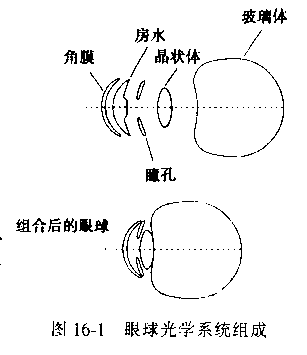 眼作为一种以光作为适宜刺激的视觉生物器官,从光学角度可将眼看作一种光学器具,即一种复合光学系统。眼球的光学系统成分由外向内为角膜、房水、晶状体和玻璃体。