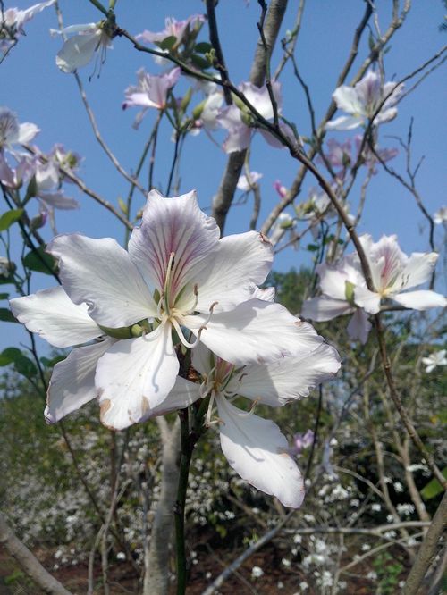 白花羊蹄甲Bauhinia variegata L.羊蹄甲属,又名老白花皮,白花洋紫荆,原产广东、印度。落叶乔木,叶近革质,花序总状或伞房状,顶生或侧生,总花梗短而粗,花托长12毫米,花蕾纺锤形;苞片及小苞片卵形,早落;花萼佛焰苞状,花大,花瓣白色或淡红色。花期3-5月,果期5-8月。