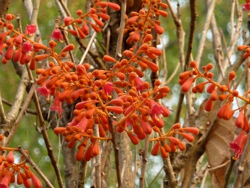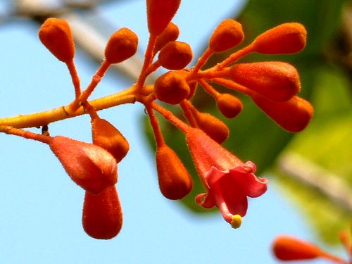 火桐Erythropsis colorata (Roxb.) Burkill 梧桐科,落叶乔木,高可达15米,是先花后叶植物。火桐属濒危物种,国家2级保护植物。因先花后叶,花色鲜艳靓丽,具有很高的观赏价值,是园林绿化和行道树的佳品。火桐主要生长于热带雨林中,海拔 400米至900米之间,所在地的气候特点是夏秋炎热湿润,冬春凉湿,少雨,土壤为赤红壤或砖红壤,耐荫蔽,一般在常有云雾的山谷阴湿的地方生长良好。