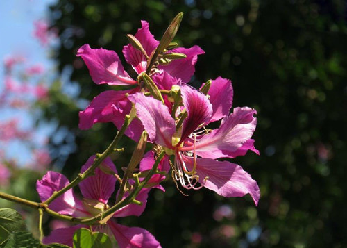 洋紫荆花型貌似兰花,花瓣5枚,花大艳丽,容易培植,西方人最初形容为“穷人的兰花”,只要周围空间广阔,阳光充沛,便可茁壮成长。洋紫荆于1880年在香港被一名法国神父发现,1965年正式被定为香港市花。洋紫荆常被人们用来比拟亲情,象征兄弟和睦、家业兴旺。因此,洋紫荆便成为香港特别行政区的区花。紫荆有别于香港区花洋紫荆的最大特征是,在能老枝上开花。其叶子,两者也不大相同,紫荆的叶子呈心形,而洋紫荆的叶子则是广卵形。先端裂开,看起来好似羊蹄。