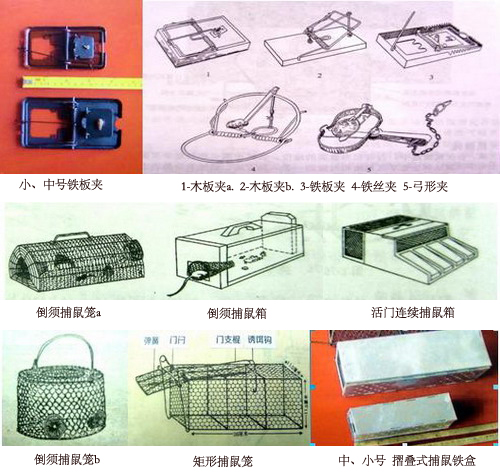鼠夹和鼠笼的样式很多,各有特点和功能,图1展示了几种常见的。鼠笼用以关住活鼠;倒须笼、活门箱可连续捕鼠,在鼠多的场所,如仓库、养殖场等处最适用。普通家庭使用结构简单的木板夹或铁板夹就可以了。家鼠对木夹较少疑惧,铁夹则较耐用且易清洁。夹有不同型号,打小家鼠用小号,中型鼠得用中号,否则会打不着。夹、笼选购注意结构要紧密、弹簧力度要适中。