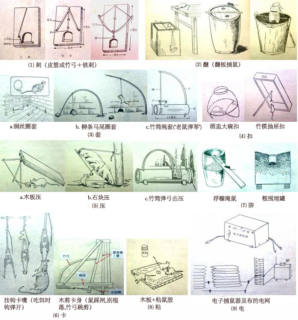 除了夹、笼,实际灭鼠器械种类很多,仅一次展览会上就展示了300多种,有特制专用器械,有用普通器物的,大多数是利用力学的反弹、平衡原理,或利用杠杆作用,样式则五花八门。所以器械捕杀又称物理防治法,是历史最悠久、民间应用最广泛的灭鼠方法。许多器械可由民众自制,耐久而省费用,对人畜安全,好推广,曾在“除四害”爱国卫生运动中大发威力。总的来说,器械法可以归结为:夹、关、刺、翻、套、扣、压、卡、阱、粘、电;用于农田时,还有挖(鼠洞)、淹(灌水)及掀(草垜)等,总称“物理灭鼠14策”。图4列举了用于灭家鼠的若干实例,其中有用诱饵的,有不需诱饵而置于鼠洞口或鼠路上捕杀的,多用竹、木等材料制作,就地取材,成本低廉,但多需要掌握相当的技巧才能奏效。