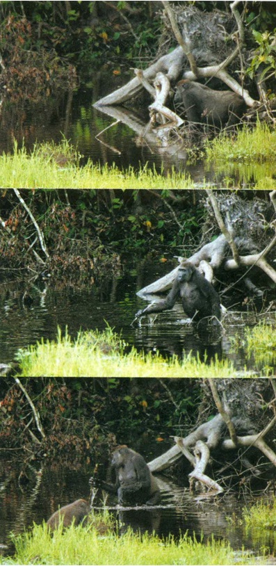 【用木棍探测水深的大猩猩(图/Breuer T,et al.PLoS Biol,2005)】