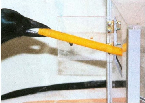 为什么我们对这些动物使用工具不觉得惊奇呢?答案是这些动物的脑具有一定的共性,即相对体型大小来说,它们的脑容量很大。鸟类也具有一定的制造和使用工具的能力,其中南太平洋新喀里多尼亚岛上的新喀鸦(New Caledonian Crow)是最典型的一个例子。在一个实验中,研究人员将新喀鸦喜欢的食物放在一个比它们的喙要长的玻璃管的底部,其中一只新喀鸦居然将金属丝弯成一个小钩,将玻璃管放倒后取出食物。另一个实验中,新喀鸦需要用一根短木棍从一个盒子里取出一根长木棍,只有用这根长木棍才能从另一个盒子里弄回它们喜欢的肉食。这也就是所谓的“元工具”任务,用一种工具获得另一种工具,属于非常复杂的问题。然而,新喀鸦能在相对较短的时间里想出解决策略,并且按合理的顺序来执行。更重要的是,它们并不是通过反复试验,从失败中找到解决办法。7只新喀鸦中有4只第一次尝试就成功解决了这个难题!当把长木棍和短木棍的位置互换时,它们从不会尝试去取出短木棍,而是带着长木棍直奔装食物的盒子。新喀鸦的表现,与黑猩猩和大猩猩在类似实验中的表现不相上下。进一步的研究发现,新喀鸦和其他有使用工具能力的鸟类如鹦鹉等,相对于其体型来说,它们的脑容量特别大。因此,脑容量和使用工具之间的联系似乎是显而易见的。对工具的使用,需要有复杂推理的能力以及预见某一特定行为所会引起的后果的能力。尽管我们无从了解动物的想法,但使用工具的动物,其行为具有一个非常明确的目的。黑猩猩确实是在“钓”白蚁,而非随意地把草叶戳到洞里。新喀鸦有步骤地先去取长木棍,其最终意图是得到食物。只有当动物具备足够大的大脑来进行必要的复杂推理时,这些行为才看起来是可行的。
