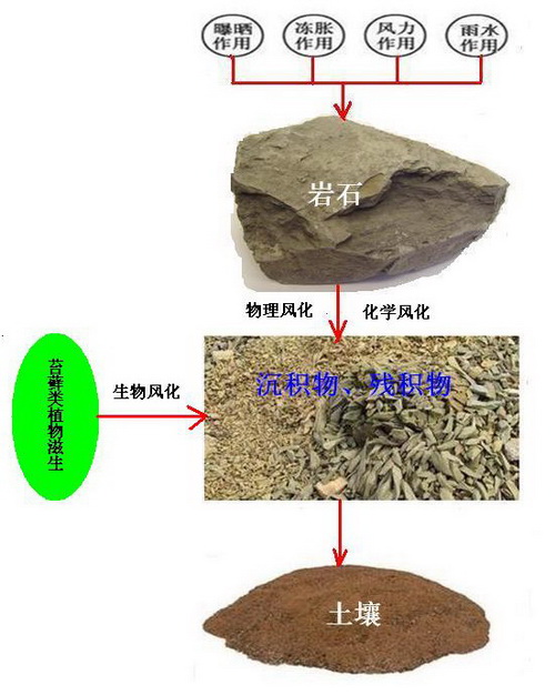 我以前是一块大大的石头,每天太阳升起后,把我的身体晒得滚烫,晚上寒风吹过,我的身体不由的收缩。因为我是热的不良导体,所以在这种冷热交替的环境中,我的身体慢慢的一层一层的剥落(这就是人们说的物理风化)。大气中的二氧化碳溶入雨水中,造成弱碳酸。这些酸使我身体中的矿物质发生化学分解作用,产生新的物质(也就是化学风化)。我在物理风化和化学风化的作用下风化成了一堆疏松的风化壳。风化壳在重力、流水、风力等作用下被迁移形成崩积物、冲积物、海积物,它们被统称为运积母质。还有部份风化壳留在了原地,形成残积物,人们把它称为残积母质。