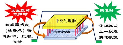 我们利用三维芯片设计思路,将中央处理器和快速非易失的铁电存储器集成到一起,并设计了一个独立硬件,它能周期提取处理器状态,并压缩该状态,快速存储到铁电存储器上。芯片发生致命故障时,处理器系统无法工作,但它断电前的瞬间状态会被保存到非易失性存储器中。恢复后,该处理器能从上一次断电时的场景恢复。由于采用了三维设计和压缩技术,可将恢复间隔缩短至微秒级。这项技术很容易扩展到大型芯片和电子系统中,为一些重要领域的芯片稳定可靠运行提供技术保障。