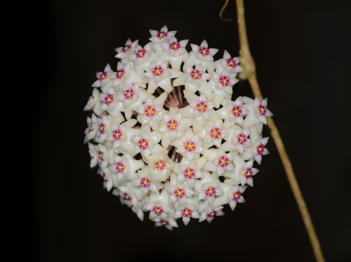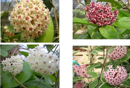 球兰(Hoya spp.)属植物为多年生常绿藤本植物,全株有乳汁,节茎上生有气生根,长达3-7米,有极强的攀附力,叶厚肉质对生,无毛,花腋生或顶生为伞形状聚伞花序,是由18-34个小花呈星形簇多个小花组成的大绣球,花冠各异色辐状裂片五角星状展开,呈星状,球形伞形花序,花期很长。