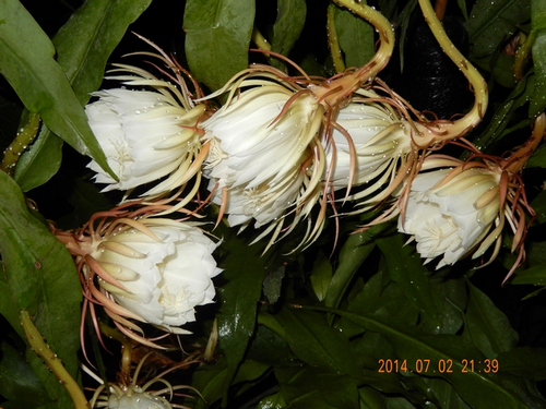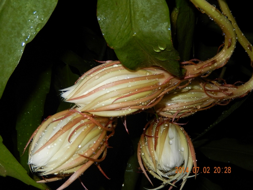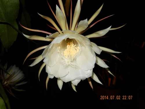 此花一般在晚上8-12时开花,约4-5小时即凋谢,花开到花谢持续时间很短,故有“昙花一现“之说。昙花生长时花蕾下垂,经开时,花瓣缓缓张开而微微颤动,筒部向上翘起。花洁白如玉,清香四溢。因而被誉为“月下美人”。
